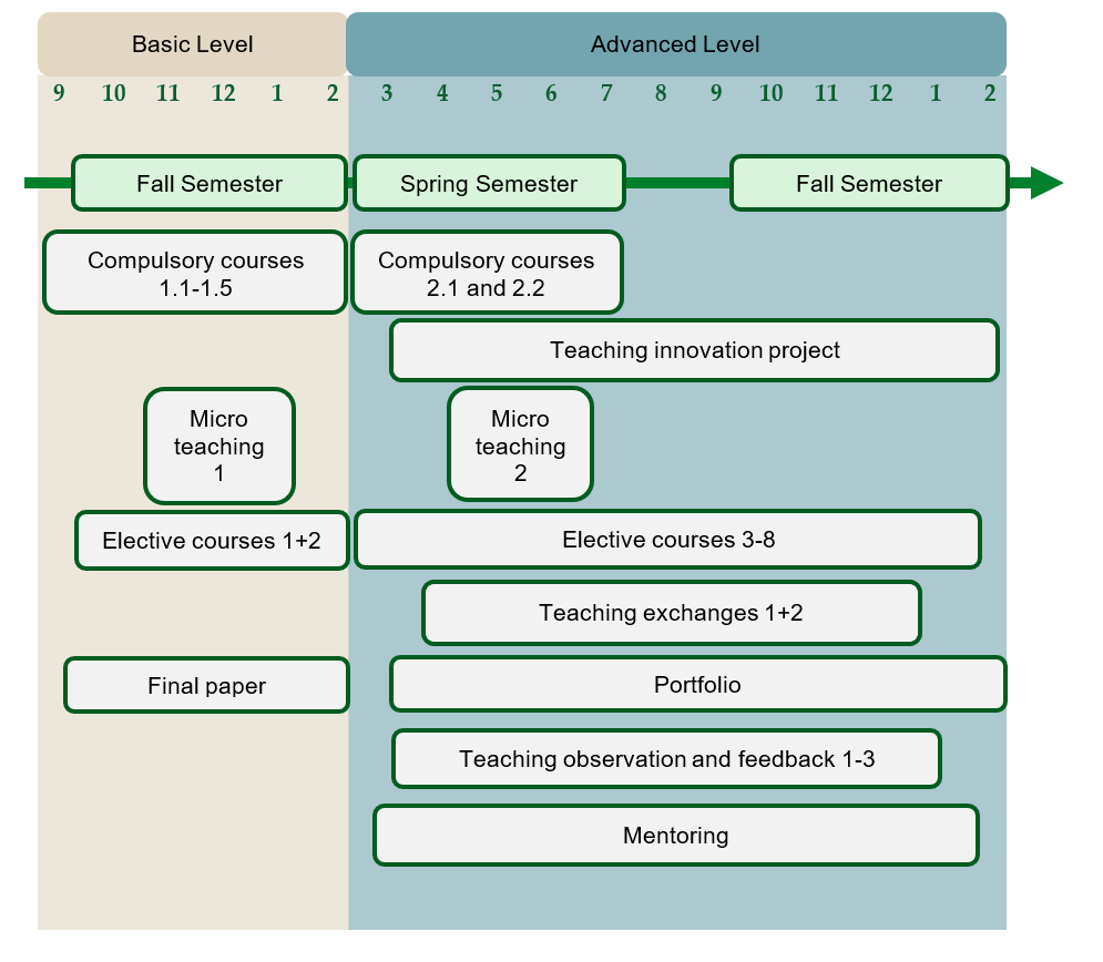 The basic level takes place in the autumn semester. The advanced level can (but does not have to) be started immediately after the basic level in the spring semester. If all components of the basic and advanced levels are completed immediately after one another, a certificate (CAS HSG learning and teaching in higher education) can be obtained after 1.5 years.