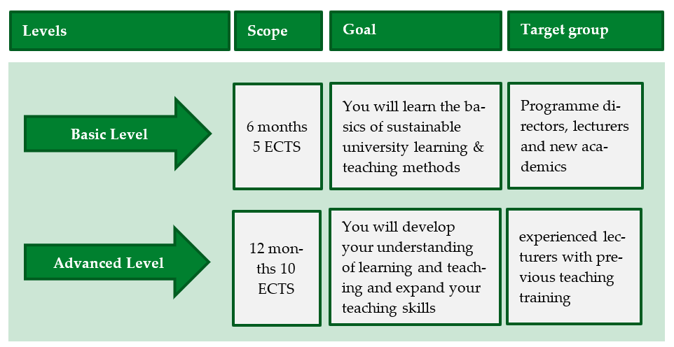 Our continuing education programme is structured in two levels. The basic level is the first level of the CAS, in which you acquire a solid foundation for developing your teaching skills in the advanced level. If you attend the basic level, you will receive a certificate of participation. If you also complete the advanced level, you will receive the CAS HSG in Learning and Teaching in Higher Education upon successful completion. If you have the relevant prior knowledge, direct entry into the advanced level can be considered. Self-organised learning (SOL) plays an important role at all levels.