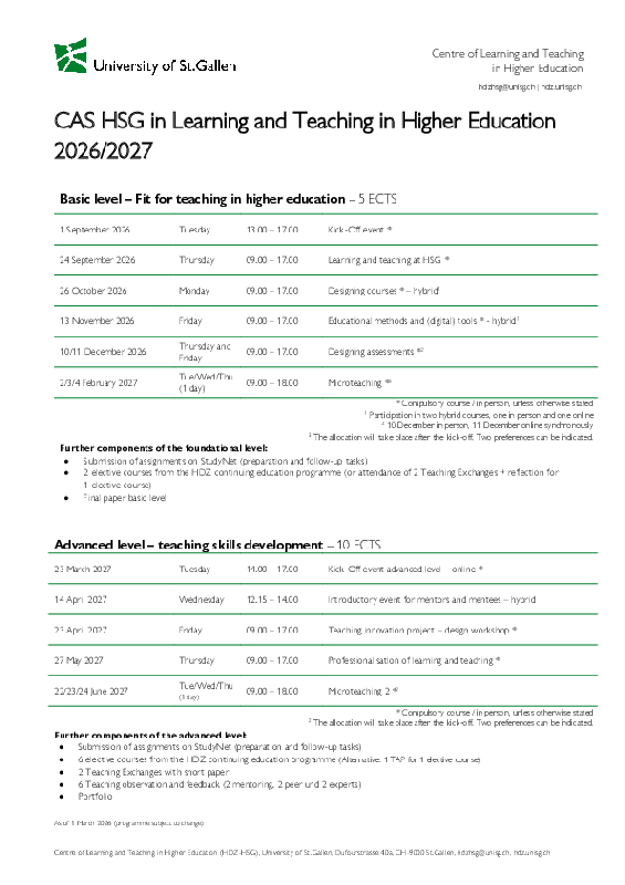 | 24 September 2026 | Thursday | 09.00 - 17.00 | Learning and teaching at HSG * |